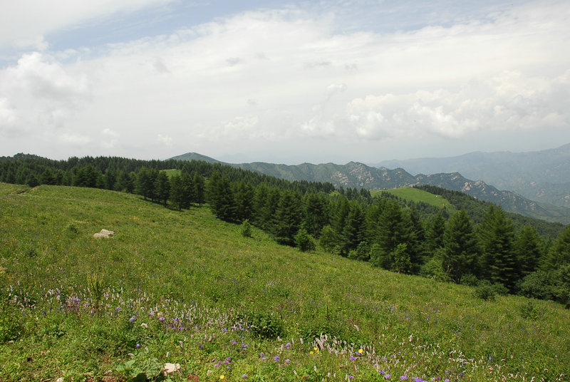 我的目的地是一座海拔1500多米的大山“馬圈背”。這座山上的山蔥像人工播種的一樣,遍地都是。我先爬上“盤道”山,再走進(jìn)“馬圈背”。我在大約40度的山坡上老牛一樣爬行著。山坡的低處布滿雜草和野花,解放前,這里是一片白樺林,60年代白樺林變梯田,種植燕麥、山藥、蘿卜等農(nóng)作物,再后來(lái)逐漸荒蕪。往上走300多米便進(jìn)入林區(qū)。我在一條雞場(chǎng)小路上時(shí)而迂回、時(shí)而直行,走10幾分鐘便稍作休整。