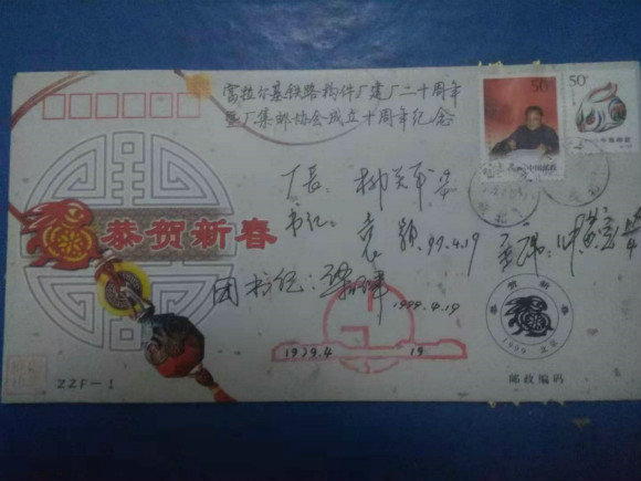 當(dāng)年,在慶祝鐵路構(gòu)件廠成了20周年的時(shí)候,公司黨委舉行了書(shū)畫(huà)展、橋牌賽、集郵展及兩代人話改革等很多有意義的活動(dòng),我的自制封就是在那個(gè)年代產(chǎn)生的。我特邀請(qǐng)了當(dāng)年企業(yè)黨政工團(tuán)的4位領(lǐng)導(dǎo)在自制封上簽名留念,并自制了廠徽蓋于自制封的正下方。在自制封右上角的兩張郵票中就有一枚選用的是1998-30紀(jì)念郵票中的(2-1)“鄧小平在全會(huì)上”,此枚郵票是根據(jù)鄧小平同志在黨的十一屆三中全會(huì)上作《解放思想,實(shí)事求是,團(tuán)結(jié)一致向前看》重要講話的珍貴歷史鏡頭設(shè)計(jì)的,再現(xiàn)了一代偉人的高瞻遠(yuǎn)矚和博大心胸。