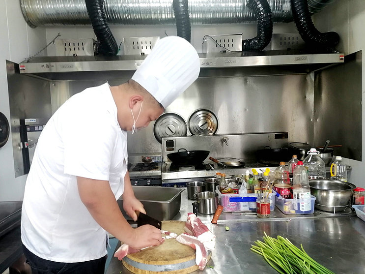 大廚每天要早晨五六點(diǎn)鐘起床,七點(diǎn)開早飯,一日三餐,每頓飯四菜一湯。遇到節(jié)假日項(xiàng)目部聚餐,看到大廚在廚房里揮汗如雨,還樂呵呵的樣子,我就覺得這小伙兒心態(tài)真好。