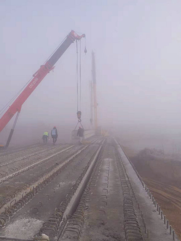 據(jù)悉, K187+340車行天橋全長332.281米,橋面寬8.5米,由4孔16米24片簡支空心板梁組成。梁體重分別為30.5噸和25噸。其中上部結(jié)構(gòu)為預(yù)應(yīng)力混凝土(后張)簡支空心板梁,下部結(jié)構(gòu)橋臺(tái)采用柱式臺(tái),橋墩采用柱式墩,墩臺(tái)為樁基礎(chǔ),樁基礎(chǔ)全部為摩擦樁。 承擔(dān)架梁施工任務(wù)的中鐵二十三局二公司甜永項(xiàng)目部,克服了施工作業(yè)面窄,安全風(fēng)險(xiǎn)高等 不利因素,對(duì)便道整修,板梁運(yùn)輸、梁體就位、汽車吊裝、支座安裝、隊(duì)伍組織、安全技術(shù)保障等進(jìn)行了詳細(xì)部署及技術(shù)交底,制定了嚴(yán)密的架梁專項(xiàng)施工方案、作業(yè)流程圖和應(yīng)急預(yù)案。架梁過程中,他們強(qiáng)化對(duì)每一道施工工序的風(fēng)險(xiǎn)點(diǎn)跟蹤和檢查,加強(qiáng)聯(lián)防聯(lián)控,嚴(yán)格提提、運(yùn)、架梁過程中的標(biāo)準(zhǔn)化作業(yè),確保施工安全萬無一失。