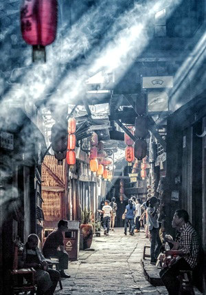 拖鞋踢踏過青石板的小道