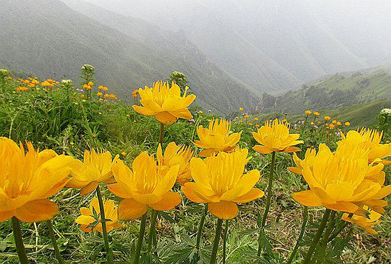 清晨的駝梁山頂,常常被薄霧籠罩。金蓮花在霧中若隱若現(xiàn),像披著輕紗的仙子,花瓣上掛著晶瑩的露珠,輕輕一碰便滾落下來,滴在泥土里,滋養(yǎng)著新的生命。等到太陽升起,霧氣散去,花海便又恢復(fù)了熱烈的模樣,游客的笑聲、相機(jī)的快門聲、蜜蜂的嗡嗡聲,與山間的鳥鳴、溪流的潺潺聲交織在一起,成了最生動的山間樂章。傍晚時分,夕陽為金蓮花鍍上了一層暖紅,花海從明黃變成了橙金,與遠(yuǎn)處的晚霞相映成趣,引得不少游客駐足遠(yuǎn)眺,遲遲不愿下山。