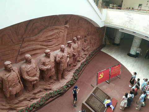 在雕塑的正后方便是百色起義紀(jì)念館,江澤民題寫的“百色起義紀(jì)念館”七個行書鎦金大字熠熠生輝。四根粗大圓柱穩(wěn)穩(wěn)地支撐著外廊,象征著百色人民頂天立地、砥柱中流。大門兩側(cè)分別雕刻著有“土地革命”和“武裝斗爭”的場面的白色浮雕。沿著開滿鮮花的花壇一側(cè)拾階而上,懷著崇敬的心情步入序幕廳。序幕廳正壁是“百色起義”漢白玉大型浮雕,以磅礴的氣勢,再現(xiàn)了鄧小平等老一輩無產(chǎn)階級革命家的光輝形象及當(dāng)年百色起義波瀾壯闊的場景。在大廳正壁的浮雕前,展館特意擺放了中國共產(chǎn)黨黨旗和入黨誓詞,便于前來參觀的黨員同志面對先烈、面對黨旗重溫誓詞,不忘初心,踐行使命。