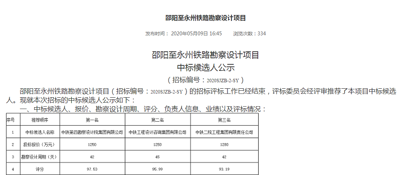 5月9日,國鐵集團(tuán)發(fā)布邵陽至永州鐵路勘察設(shè)計(jì)項(xiàng)目中標(biāo)候選人公告:
