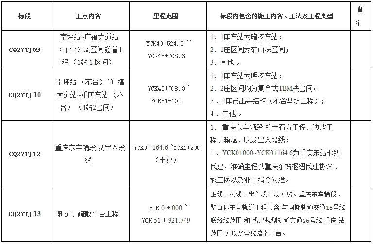 本招標(biāo)項(xiàng)目里程樁號(hào)為:YCK40+524.3~YCK51+102線路長度為10.58km(包括重慶東車輛段及出入段線,南坪站(含)~重慶東站(不含)的區(qū)間工程及車站工程等,對(duì)應(yīng)CQ27TJ09~CQ27TJ13等4個(gè)施工標(biāo)段。