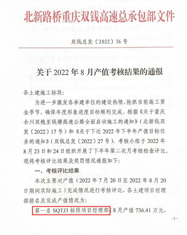 重慶訊(通訊員 翟潤潔)近日,北新路橋集團長沙分公司重慶雙錢高速公路土建施工SQTJ3標段項目傳來捷報,該標段在錢雙公司下半年第二次月考核檢查評比中獲得第一名。