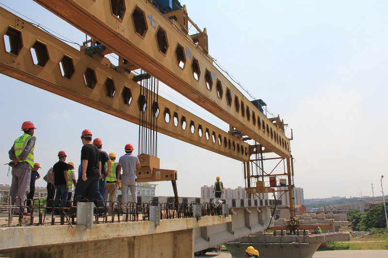 “T梁架設(shè),安全是第一位,為保證繞城特大橋首片T梁萬無一失,從架橋機的進場試運行、支座的穩(wěn)定性、橋面間隙等進行嚴格把控,對架梁過程中的起吊、推送、橫移、落梁、就位等一系列細節(jié)進行死盯嚴防,‘做到一點也不差,差一點也不行’,從而實現(xiàn)了‘穩(wěn)就是快、穩(wěn)就是安全,穩(wěn)就是效益’的良好開端。”安全總監(jiān)郝雷介紹道。