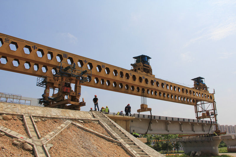 在新港江北鐵路繞城特大橋頭,這里艷陽高照,三十多名施工人員奮戰(zhàn)于此,工地上一派繁忙景象。據(jù)施工現(xiàn)場負責(zé)人趙建平介紹,首片T梁從制作到養(yǎng)護完成共需要10天,端午節(jié)前就做好了各項準備工作,節(jié)后一開工,他們便立即投入到了緊張施工之中,本次T梁架設(shè)架設(shè)僅用時50分鐘,整個起吊、推送、橫移、落梁、就位動作一氣呵成,工序銜接順利,歸功于前期項目部的精心組織,細心安排,才保證了架設(shè)全過程安全、平穩(wěn)、有序、可控。
