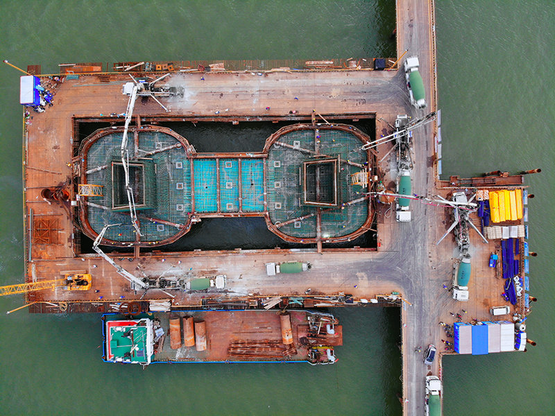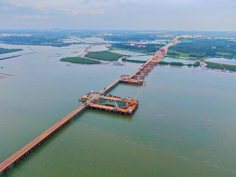 由于大橋?yàn)榭绾4髽?,為確保工程質(zhì)量,承臺(tái)鋼筋全都采用其抗腐蝕性強(qiáng)、耐久性好的環(huán)氧鋼筋;大橋共需混凝土總方量約36萬(wàn)方,均采用海工高性能耐久混凝土。在施工中,中鐵大橋局克服地質(zhì)條件復(fù)雜、海上施工環(huán)境惡劣、臺(tái)風(fēng)影響頻次高、征拆協(xié)調(diào)難度大等困難,發(fā)揮建橋國(guó)家隊(duì)的技術(shù)和管理優(yōu)勢(shì),加強(qiáng)超前謀劃,不斷優(yōu)化方案,強(qiáng)化技術(shù)管控,積極融入項(xiàng)目征拆,有力的促進(jìn)了工程進(jìn)展。目前,大橋項(xiàng)目路基、涵洞、主橋樁基、承臺(tái)及引橋樁基、下部結(jié)構(gòu)、上部結(jié)構(gòu)、箱梁架設(shè)均已展開施工,項(xiàng)目開累完成投資近40%。