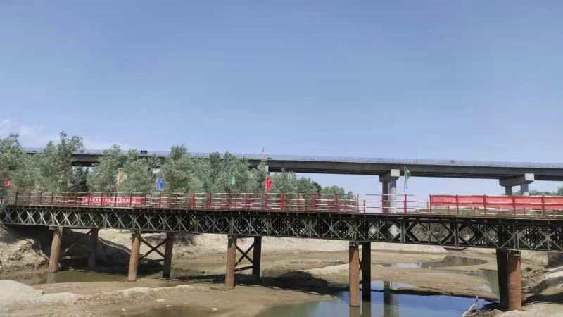 鋼棧橋全長60米,采用上承式結(jié)構(gòu),由貝雷梁、型鋼分配梁、橋面板及鋼管樁基礎(chǔ)組成,設(shè)計最大承載能力120t,由南向北橫跨葉爾羌河,是重要的臨時性過渡通道。鋼棧橋的建設(shè)完成,為項目施工的主要材料和設(shè)備運輸通道提供了保障,縮短了施工材料、機械設(shè)備運輸距離近。